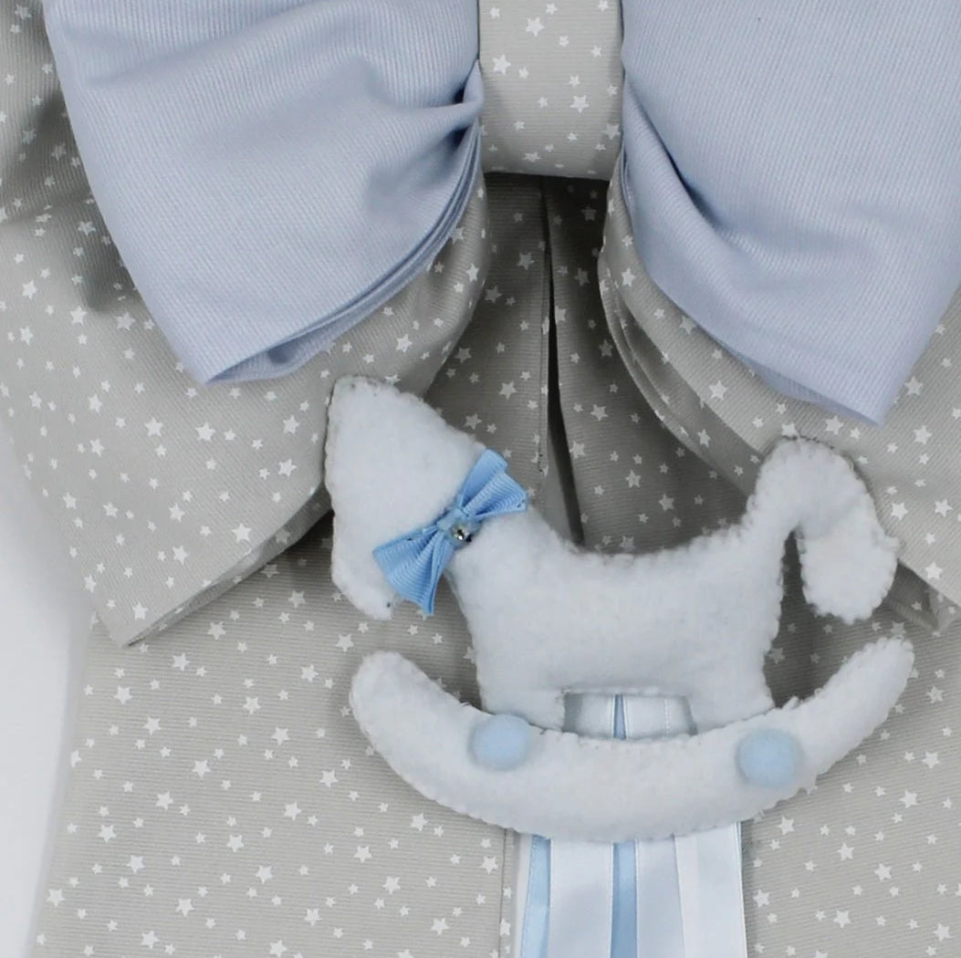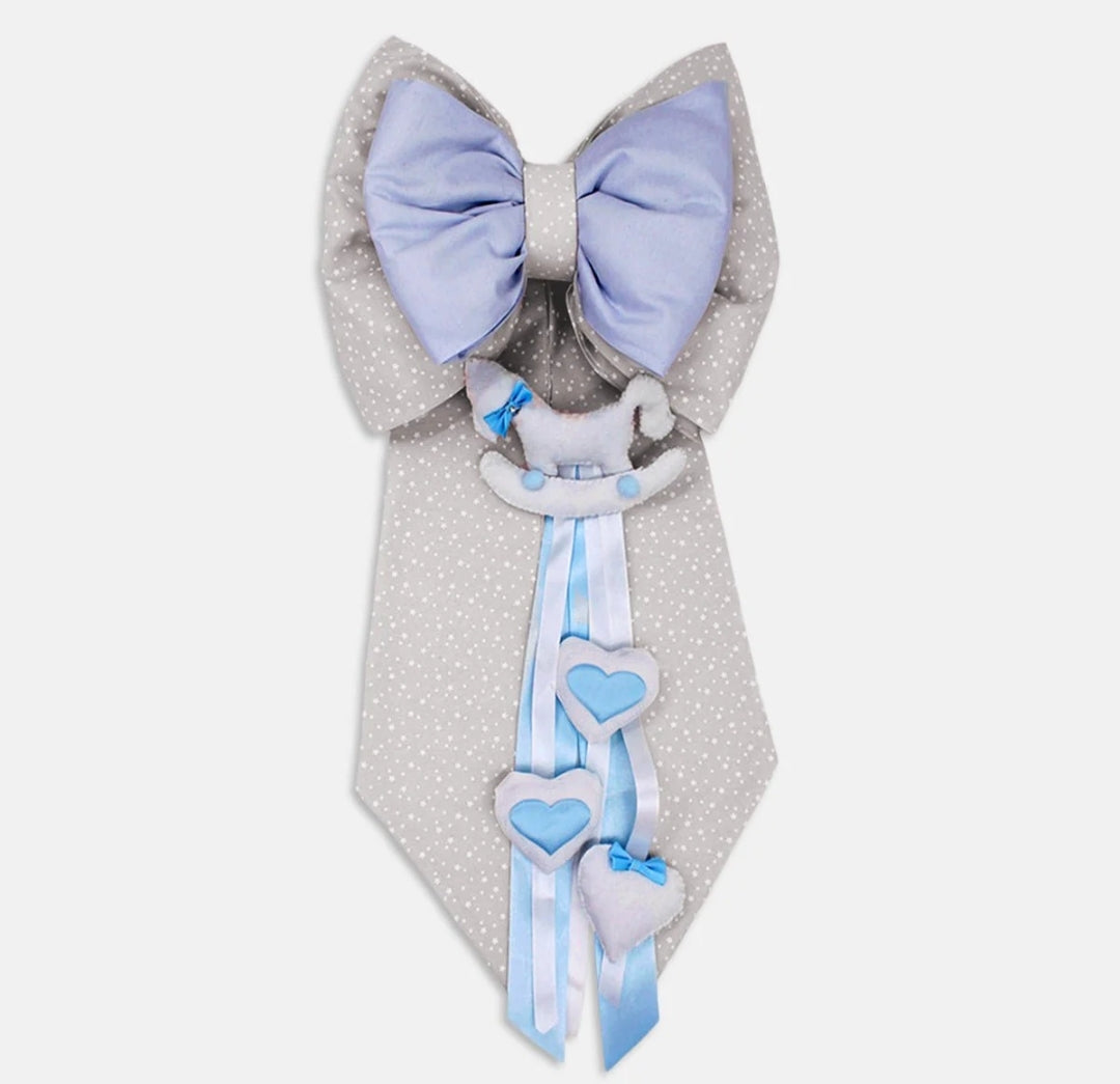 Questo fiocco nascita artigianale è realizzato a mano con cura e amore, utilizzando tessuti di alta qualità nei delicati toni dell’azzurro e del panna. Con un’altezza di circa 90 cm, è un elemento decorativo importante e d’effetto, perfetto da appendere alla porta di casa, in ospedale o nella cameretta del neonato.
