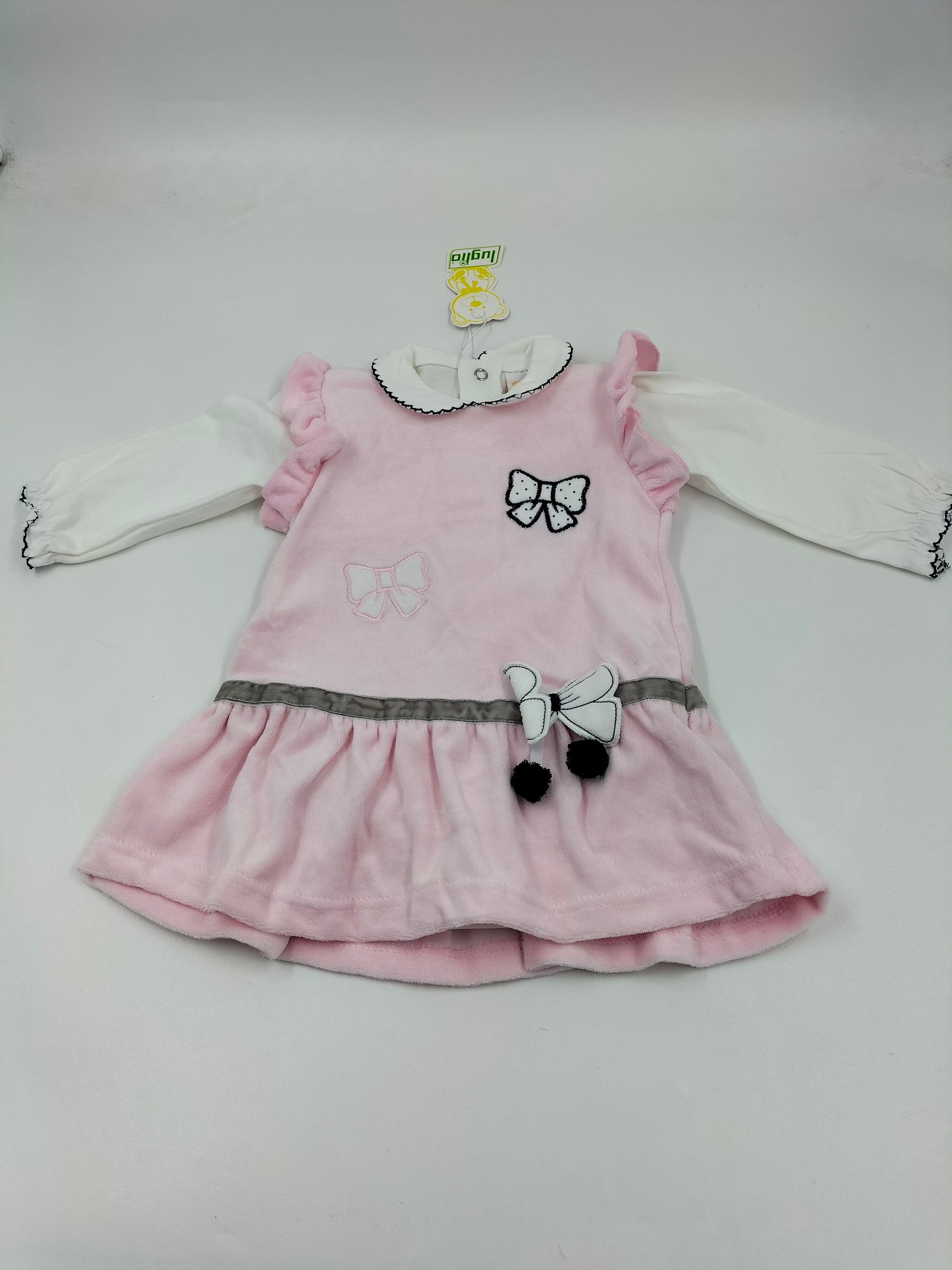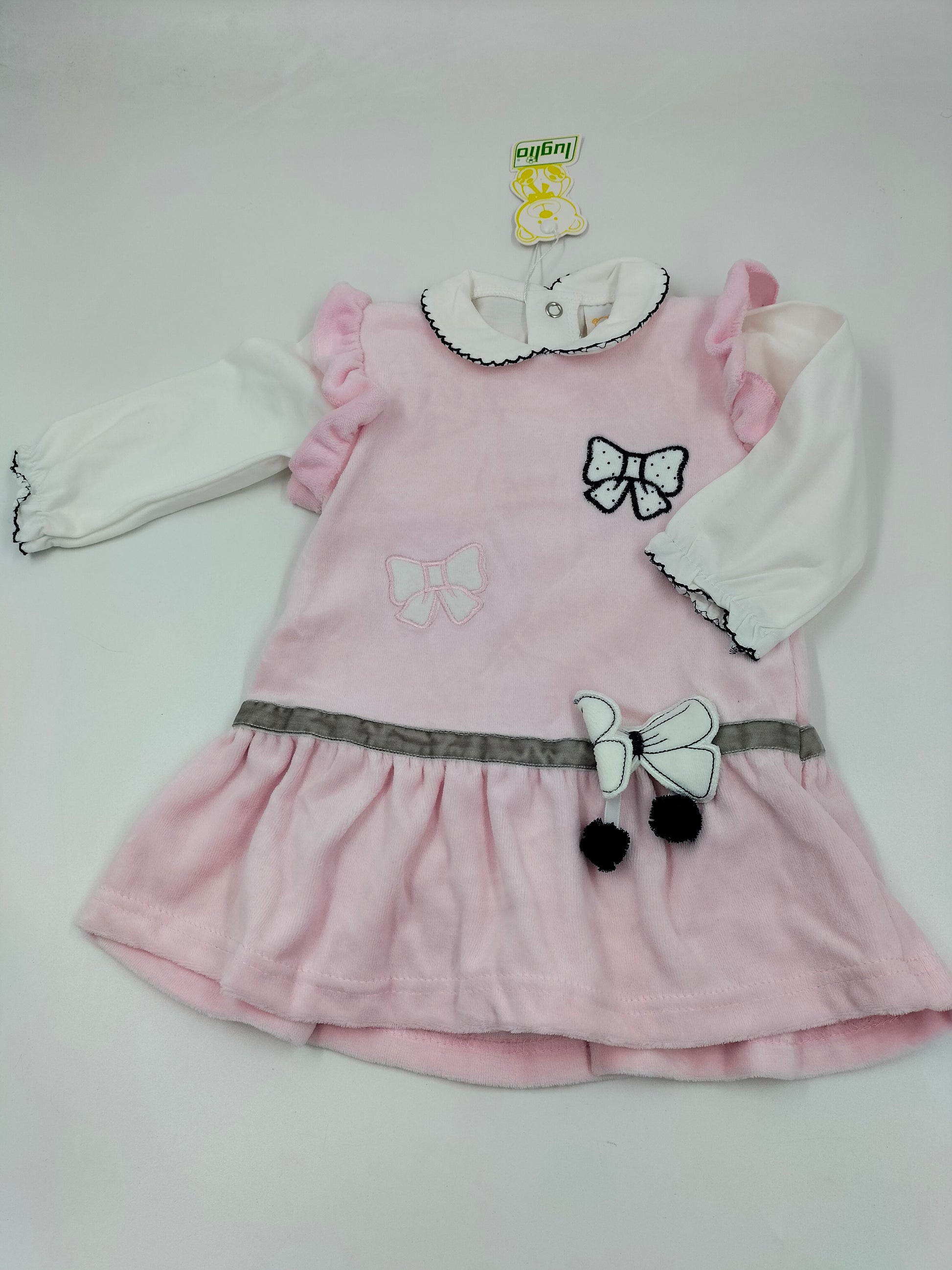 Un outfit tenerissimo e raffinato, perfetto per le occasioni speciali. Il vestitino in morbido velluto rosa è arricchito da delicate applicazioni di farfalle, mentre il body coordinato con colletto completa il look con eleganza. Morbido, comodo e incantevole: un capo pensato per far risplendere ogni piccola principessa.